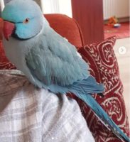 Cameron is a male. Coloring is bright blue with a black “ring” around the neck, red beak, blue iris of the eyes. Cameron can say, “really”. He also likes to squawk. Cameron has a purple leg band. Owner will supply complete band information. He may be in the company of his mate, Laala (female yellow Indian Ring Neck).