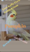 Four year old sweet yellow cockatiel. Will land on your head or shoulder. Missing part of one toe. Hates kissing noises.