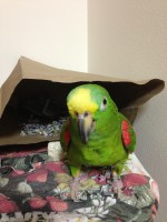 Loren is a female yellow-head parrot. We’ve had her since 1989. She’s mostly bright green with a little yellow section at the front of her head, above her beak. Her beak is tan and black, very sharp. She bites if she’s scared so be careful! She has some red in her wings and tail. She’s about 7 inches tall, maybe, from her claws up to her head. And she has a silver bracelet on her left claw (that’s her left, not yours), which is a registration number from the Fish and Wildlife Service from when we imported her into the country in 1999. She has a really long nail in the back of one of her claws which is so long it’s curled all the way around (she wouldn’t let us clip it). She speaks Spanish, saying things like, “Hola!” She sings “Mi Pollera” (which sounds like “poyera”). She laughs hysterically and screams hysterically. She mumbles to herself when no one is paying attention to her, saying things like “ay que bella esa lora.” Which means, “oh what a beautiful bird.” And she whistles, like a cat-call whistle. But she also just whistles regularly.