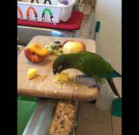 5 years old conure hybrid. Believed to be a Green cheek and Dusky hybrid. Mostly green, blue flight feathers, red tail feathers, brownish maroon hood/cap coloring and some marron belly coloring on sides. Named Paco. Please contact Kate at (925) 595-2599 if seen or found. He will say “whatcha doing” and “stop it”