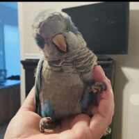 Oats is a year old BLUE Quaker Parrot, and he is disabled. He was born with one leg out of place that sticks up on his side at all times, he is also missing toes on both sides.