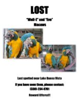 Walle and eve are great at flying. They travel far. Please contact any sightings!
