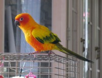 She is Orange/red on her face, yellow body, and blue and greed tail feathers. Please call me if found 727-488-6082