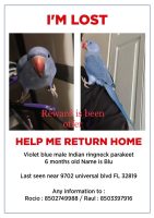 Blu is a violet blue indian ringneck currently molting, has is wings uneven, he will jump on any one’s shoulders but don’t like fingers