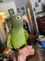 Description: Blue crowned conure 24 years old. Blue head green body and some red on tail and wings. Friendly and talks a lot and very well! Counts to 5 Fav # is 3 fav song is in the mood by Benny Goodman. He sings along. Some phrases are good morning how are you, I love coco and Pepe too, and singing. He asks for clean water and says give mommy a kiss among other things. Loves plain unsalted pistachios! Reward offered! Please spread the word and contact Madisin with any information! He’s so smart and I know he must be nearby! He knows humans can help him and I’m sure he will try to find someone when he gets hungry.