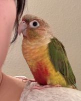 Has a missing right eye, blue flight feathers, red tail feathers, yellow and red belly, green wings, and beige head.
