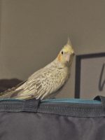 Her colors are gray, yellow, and white, with quite orange cheeks. She appears to be a female. She hardly sings or whistles. She is quite nervous around strangers and doesn’t like to be held. However, she does like to approach people on her own. She loves to play with things she finds curious and loves looking at herself in the mirror.