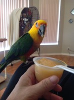 Pepper is a Jenday Conure. About 12″ with Yellow head, Orange Body and Green wings. He prefers dogs over humans. He is fully flighted. He does not eat bird seed, we feed him bird Mash and Farina. He says Nite Nite Mama and a few other words. He is only 2 yrs 7 mths. Please email me at Bawbbysgirl@gmail.com Cell-561-859-7511 Home 561-653-1801. He is banded and will supply numbers if found. Thank you Hope