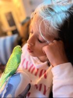 Lemon is very tame. Loves people. He loves to sit on our heads and play with our hair. He is yellow, with green and has yellow patches on his breast.