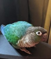 Bean is a green cheek conure with turquoise on the tips of his wings. He was lost at the zip code 30297 in the city of Forest Park on 6/10/2023. He is not clipped.