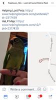 My bird Mac is a small bird with a large orange forehead. She will respond well to someone snapping or cat-calling. She likes men with beards more than any other person and will more than likely fly right to you if you fit this description. If you spot her, she may try to come to you if you call for her. She is friendly but very scared. She was last spotted in Freetown, MA late Monday night.