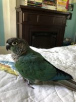Ren is a super sweet 5 yr old conure that is not a very strong flier. As I’m writing this (May 1st) he has been flying away and coming back to circle and squawk at my other conure but is too afraid too fly