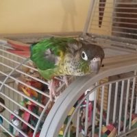 Small green cheek conure with mostly yellow breast and peach-colored feet.