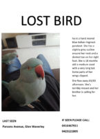 Ivy is 18 months old, hand-reared by myself, blue Indian Ringneck Parakeet. She flew away in the afternoon of 03/03. Her brother keeps calling for her but no response from her. She has a dent on her right toe. Please help us find Ivy. She is missed and we are desperate to find her.
