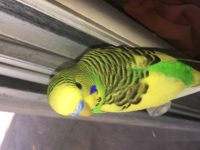 He is very young and sweet. Mostly yellow with bright green. Dark blue cere. He responds to kissing sounds and his name.