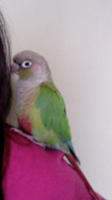 Green cheek conure – grey head, green body, blue wing tips, red tail