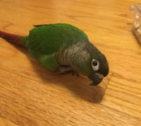she has a maroon tail and a little bit of a maroon belly, she also has some black spots down her back and her flight feathers are blue/turquoise