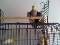 Grey with yellow face, large white patch behind his head, sleeps a lot!