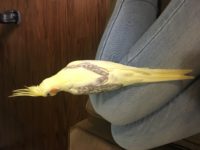 ID band on right leg and may respond to name or whistling with screams. Favorite treats include millet seed, nutriberries, or cereal flakes (e.g special k, cheerios). People friendly and knows “step up”. Is flighted, but not fully flight trained.