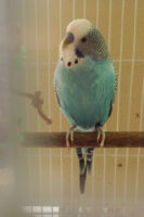 he isnt very friendly with others, and gets spooked often. He has a aqua chest, and black and white tail and stripped head