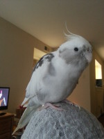 Cookie is a very sweet black and grey cockatiel. He may fly to your shoulder or your head and is very sweet. He may respond to his name or to a cat-call whistle.