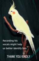 Hutch has a fairly extensive repertoire; mimics various bird calls & [poorly] some sounds including ability to speak certain phrases. His body has turned pale yellow with age (9 yrs) as opposed to the soft white as Lutino’s have when younger. He might come to you if you hold up your finger and call his name.