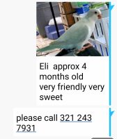 He is A white and turquoise Quaker Parrot, He likes Apples, he has not had his wings clipped.