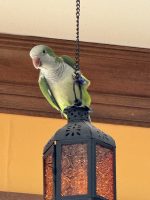 Very Friendly Quaker parrot named Cosmo. Escaped his cage and flew away S/SW from west ridge neighborhood in Chicago. Does not bite. Has blue band around left leg. Please contact me if you have him or have seen him. Reward involved!