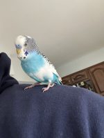 Small parakeet who is a light blue with a white feathers on his chest. He is friendly with people and likes to land on people’s shoulders. He will respond to his name Buddy