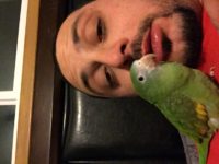 His name is Charlie and he whistles and makes a water draining noise. He is green with yellow and white on his wings.