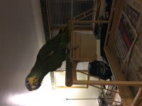 Otto will whistle the “charge” song, Ask otto to scratch head, he will repeat it and/or puff up his feathers on head/crown. Otto is very scared bird. Put index finger out first about six inches away from him and say step up, if he feels safe he will climb on your index finger. Has band, owner will supply complete band information.