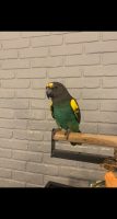 Savannah, female,10 years old, no band, eyes slightly saggy, yellow crest and wings, turquoise stomach, dark gray body, quiet bird but makes screech call, likes whistling, cashews, walnuts, sunflower seeds, millet, short tail, and about 5 inches long.
