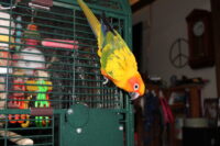 1 year old Sun Conure. Tame and handled, but very skittish. Easily startled. Very flighty.