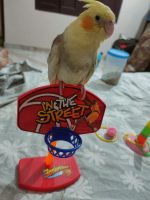 Behaviour: Pet bird but may be scared of strangers at first but he is partially tamed. May not respond to name when frightened. Usually quiet but may whistle cockatiel sounds.