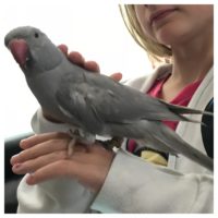Hugo is a 1 year old, grey Indian Ringneck. Very friendly. He just recently learned how to fly and escaped when I opened my back doir to let my dogs out. He’s just starting to get his black ring.