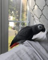 Answers to coco, talkative if comfortable. Red tail, not a professional flyer, seems like she struggled to fly but flew very high.
