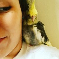 His Mohawk is always up, he has very red cheeks and white in the middle of his back.
