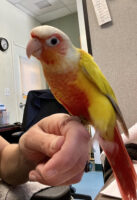 California, Lakewood, lost on 9/3/21. She flew out an open door. Female, yellow and red. Will respond to whistles and kissing noises. Very friendly and likes to land on the top of your head. Has a yellow band on leg.