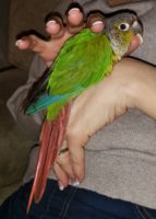 Toni is mostly green, with red tail feathers and his chest is yellow and orange.