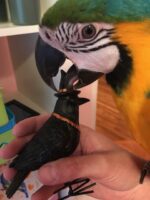 Tame. Have had calls about her. Last seen heading toward Buford. Seems to like to roost in tree tops. Wants to come down, but then flies off. She will be hungry and tired. I miss my big blue bird. Any help is appreciated. Call me anytime. Never too late or early. I need to get her back. Thanks.
