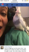 9 months old, answers to ziggy. He’s never been outside before & is still learning how to fly. He was last heard around orange wood/old pond road high up in the trees. He is very friendly and will likely land on your shoulder. Please contact Krista 2155106332 or Marisa 2155261991 if you see or hear him at all. He can wolf whistle very well and will do it back at you.