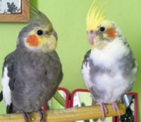 Charlie is the white cockatiel & Bella is the grey cockatiel Charlie is tamed Bella is a bit shy and is stuck to Charlie like glue there inseparable