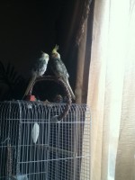 two pied cockatiels. Males. Very tame and friendly. Both respond to whistles and ‘sugar’ ‘upup’ … Their names: Sugar and Newy. Sugar has a funny looking crest (more like 1 sticking out). It’s getting cold outside.