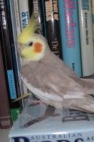 Joey is pale grey with lemon headfeathers, bright yellow crest, white flashes on wings, orange cheek spots, pale feet. His wings are not clipped.