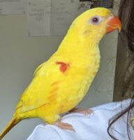 She is yellow with red markings under her wings and tail. She also has some very small red spots around her chest.