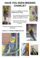 Charlie is a male cockatiel around 14-15 years old who escaped Saturday the 18th of April.