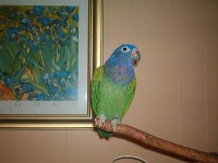 Small South American Parrot, a Blue Headed Pionus, about 20 years old. It is a female with a Periwinkle blue color head and green body with some red underneath tail feathers. She has a metal ring on one foot. Not sure what it says. This bird has changed hands a number of times and we have had her about 3 years now. We got her from a friend that could no longer care for her. Flew out the back door Sat. morning headed west. Very friendly, very much loved and very much wanted back. If she will alow you to approach her “say step up” on your finger and take her inside and notify me and I will pick her up immediately.