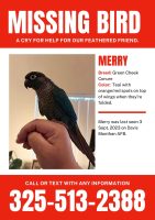 Last seen Sept 3, 2023. Her name is Merry and she has orange spots on top of her wings when they’re folded. Somewhat skittish, doesn’t like kids but very sweet once she is on your hand. Fully flighted.