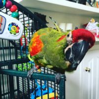 Very friendly and well socialized. Loves to chatter and says hello and her name. Brightly colored with the common colors of her species, red head, green body and orange and blue on the wings. Has a small bald spot on the back of her head.