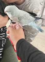 Blue in color. Very friendly. My son opened the cage while it was on the back patio and she flew out.